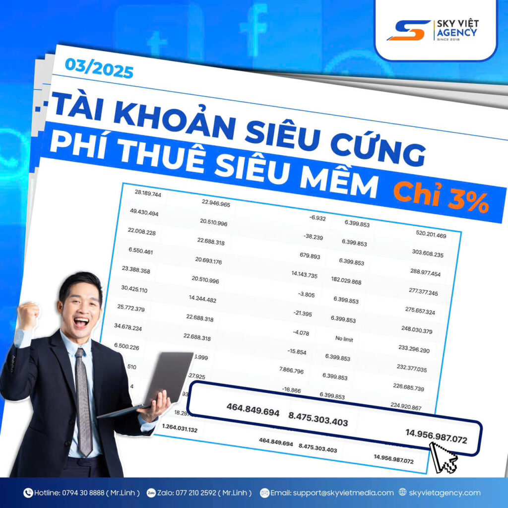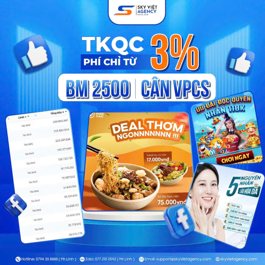 Tiết kiệm chi phí, tài khoản chạy ổn định, tỷ lệ duyệt cao, hỗ trợ nhanh chóng 24/7 và không lo bị khóa giữa chừng. Sky Việt Agency cam kết mang lại hiệu quả tối ưu cho mọi chiến dịch quảng cáo của bạn.